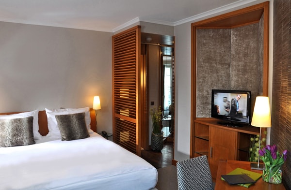Einzelzimmer Deluxe (30 m²) mit großem Kingsize Bett (180 x 210 cm), Natursteinbadezimmer mit Badewanne, Sitzecke mit Sofa oder Sessel, W-LAN, Flachbildschirm Satelliten-TV, ISDN-Telefon mit Mailbox, Minibar, Safe und begehbarem Kleiderschrank.